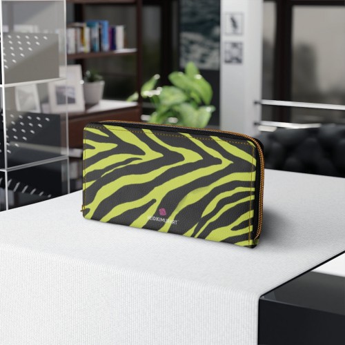 Yellow Black Zebra Print Wallet, Best Zebra Striped Animal Print Best 7.87″ x 4.33″ Luxury Cruelty-Free Faux Leather Women’s Wallet & Purses Compact High Quality Nylon Zip & Metal Hardware, Luxury Long Wallet Card Cases For Women
