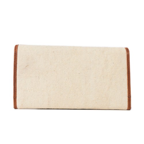 - Beige canvas body with brown leather trim
