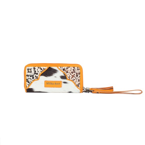 Blending embossed leather with genuine hairon hide, this western wallet is a stunning statement piece. The rich textures of embossed and hairon leather, along with a mild orange tone, capture the essence of the rodeo spirit. A zipper extending to the sides keeps essentials secure, while the RFID-protected interior offers a zippered pocket and multiple card compartments. Perfect for everyday use or a night out, this western leather wallet is both practical and pretty.