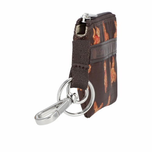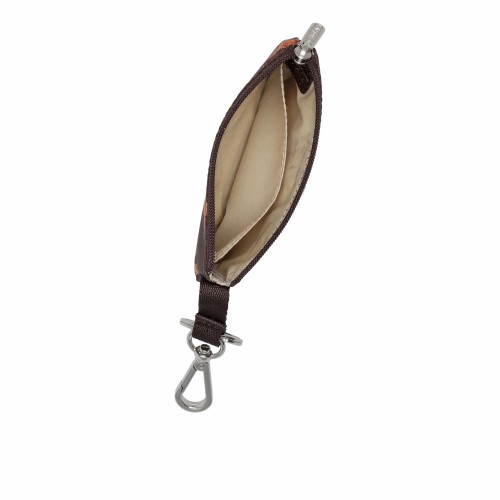 Zip main closure, 1.5in/3.8cm long webbing strap with metal keyring and clip on left side, Interior back wall open pocket