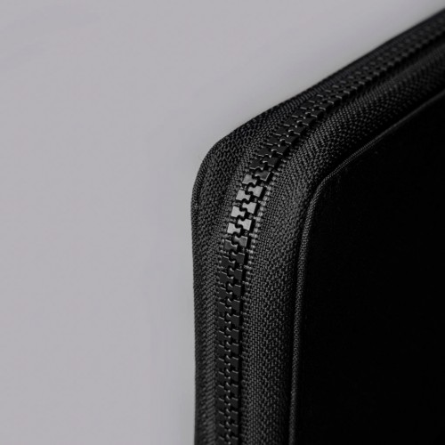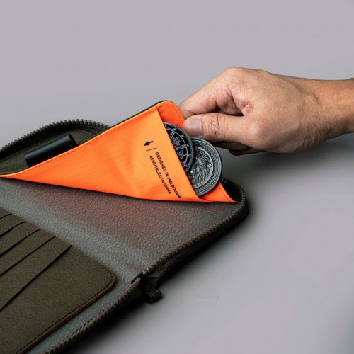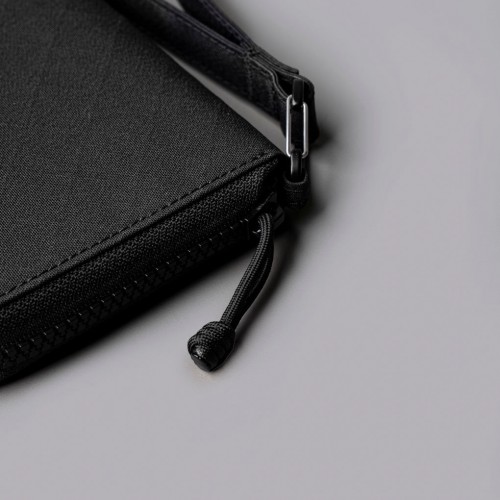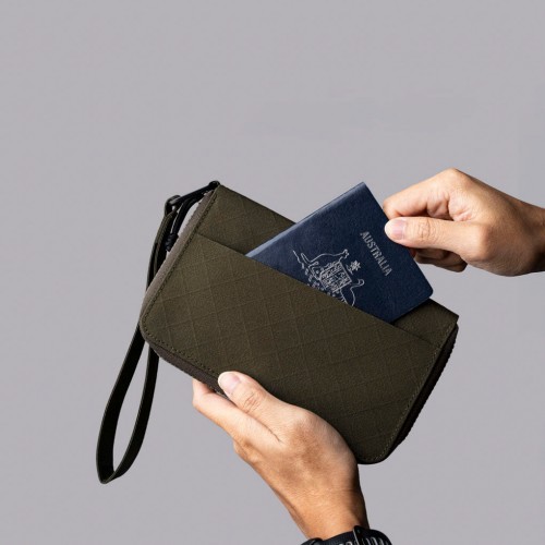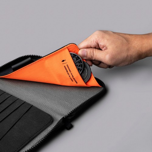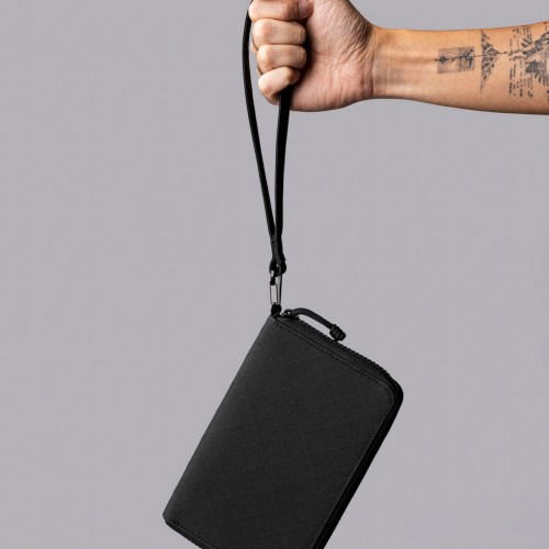 The integrated RFID-blocking lining protects your contents from digital theft, while the custom Axogrid laminate fabric resists weather and tearing without adding weight. Carry it by the hand strap through airport security, then slip it into your bag for hands-free travel.