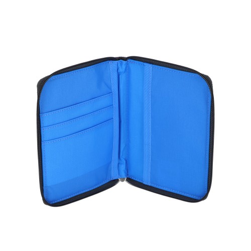 Zip around closure, Exterior front and back open pockets, Interior right side features a large open pocket for passport, Interior left side features three card pockets with larger open pocket behind