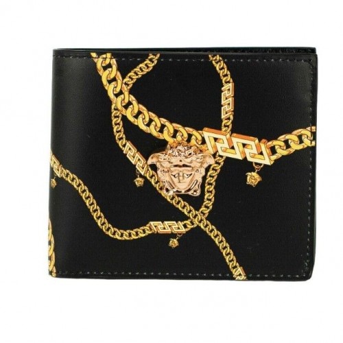 Versace Black Smooth Leather Gold Medusa Head Chain Logo Bifold Organizer Wallet