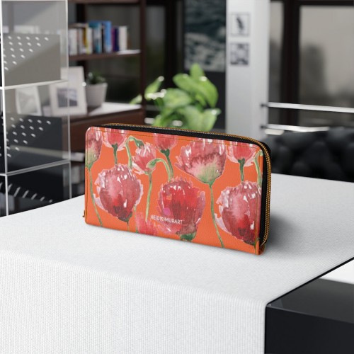 Orange Red Tulips Zipper Wallet, Red Tulips Flower Print Best Long Compact Wallet For Women