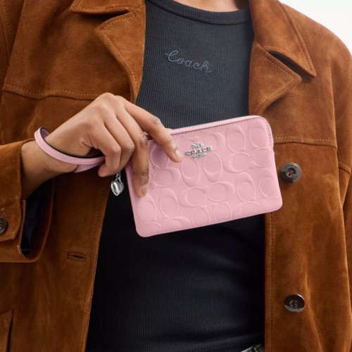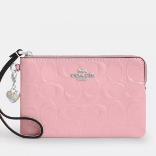 NWT Coach Corner Zip Wristlet Wallet In Signature Leather With Heart Charm In Silver/Pink