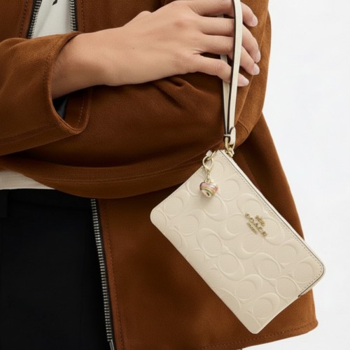 NWT Coach Corner Zip Wristlet In Signature Leather With Heart Charm In Gold/Ivory